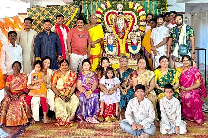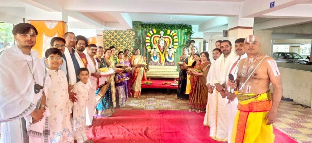 రాజేంద్రనగర్ ఉప్పరపల్లిలోని స్వాగత్ డిలైట్ అపార్ట్మెంట్స్లో శ్రీనివాస కల్యాణం కన్నుల పండువగా నిర్వహించారు. వేదపండితులు పరాశర శ్రీరామ బట్టర్, సముద్రాల శిఖామణి, సముద్రాల శ్రీమన్నారాయణలు ఈ వేడుకని సంప్రదాయబద్దంగా జరిపించారు. ఈ సందర్భంగా వారు భక్తులనుద్దేశించి మాట్లాడుతూ–‘‘శ్రీనివాసుల ప్రేమ వారి కల్యాణంతో సుఖాంతం అయింది. కలియుగదైవం శ్రీ వెంకటేశ్వర స్వామివారికి కల్యాణోత్సవం జరిపించడం శుభప్రదం. కోరుకున్న కోర్కెలన్నీ నెరవేరతాయి. కల్యాణోత్సవం జరిపించటం వల్ల అవివాహితులకు మంచి సంబంధాలు కుదిరి శీఘ్రంగా కల్యాణం జరుగుతుంది. సంతానం లేనివారికి సంతానం కలుగుతుంది. అలాగే విద్యార్థులకు విద్య బాగా అబ్బుతుంది. అదేవిధంగా వ్యాపారస్తులకు వ్యాపారం అభివృద్ధి జరుగుతుంది.. నిరుద్యోగులకు మంచి ఉద్యోగం లభిస్తుంది. అందుకే శ్రీనివాస కల్యాణం జరిపించటం సంప్రదాయం. ఈ వేడుకలో పాలు పంచుకున్నవారికి, చూసిన వారికి సకల శుభాలు కలుగుతాయి’’ అని తెలిపారు. పరాశర శ్రీరామ భట్టాచార్య–శ్రీదేవి, ములుగు సుధాకర్ శర్మ–రాధాకుమారి, రాజేంద్రప్రసాద్–స్వాతి, భరత్ కుమార్–స్నేహ, లోకేశ్వర్ రెడ్డి–శారదా దేవి, అఖిల్–శ్రావ్య, చైతన్య–ఇంద్ర ప్రియదర్శిని దంపతులు పాల్గొని, భక్తిశ్రద్ధలతో స్వామి అమ్మవార్ల కల్యాణోత్సవం జరిపించారు.