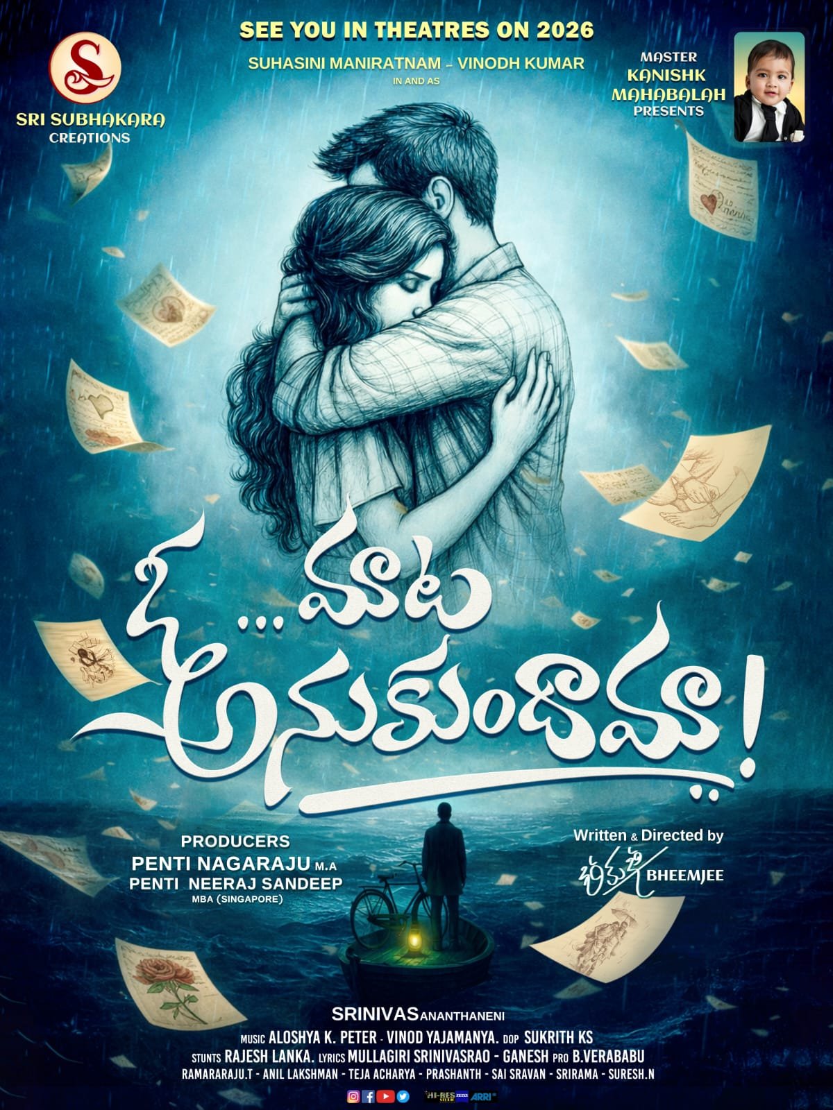 మాస్టర్ కనిష్క్ మహాబలాహ్ సమర్పణలో శ్రీ శుభకర క్రియేషన్స్ బ్యానర్పై రూపుదిద్దుకుంటోన్న లవ్ అండ్ ఫ్యామిలీ ఎంటర్టైనర్ చిత్రం ‘ఓ మాట అనుకుందామా!’. సుహాసిని , వినోద్ కుమార్, ఇంద్రజ కీ రోల్ ప్లే చేస్తున్నారు.శ్రీనివాస్ అనంతనేని, మోనికా మిశ్రా హీరోహీరోయిన్లు కాగా, శుభలేఖ సుధాకర్, కార్తికేయ దేవ్, అజిజ్ ఖాన్, అన్నపూర్ణమ్మ మిగతా పాత్రలు పోషిస్తున్నారు. భీమ్జీ కథ, దర్శకత్వం వహిస్తోన్న ఈ చిత్రానికి పెంటి నాగరాజు, పెంటి నీరజ్ సందీప్ నిర్మాతలు. తాజాగా ఈ చిత్ర ఫస్ట్ లుక్ పోస్టర్, టైటిల్ లుక్ గ్లింప్స్ని సుహాసిని మణిరత్నం, వినోద్ కుమార్ చేతుల మీదుగా మేకర్స్ విడుదల చేశారు. ఫస్ట్ లుక్ విడుదల అనంతరం సుహాసిని మణిరత్నం, వినోద్ కుమార్ మాట్లాడుతూ.. ‘ఓ మాట అనుకుందామా!’ సినిమాలో చాలా మంచి పాత్రలు పోషిస్తున్నామని, ఫస్ట్ లుక్, టైటిల్ గ్లింప్స్ చాలా బాగున్నాయని అన్నారు. ఈ సినిమా మంచి విజయం సాధించి, టీమ్ అందరికీ మంచి పేరు తీసుకురావాలని కోరారు.